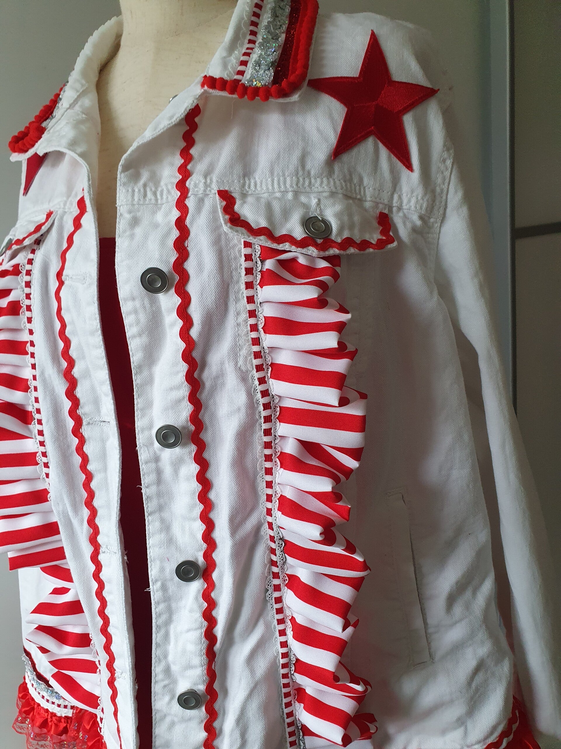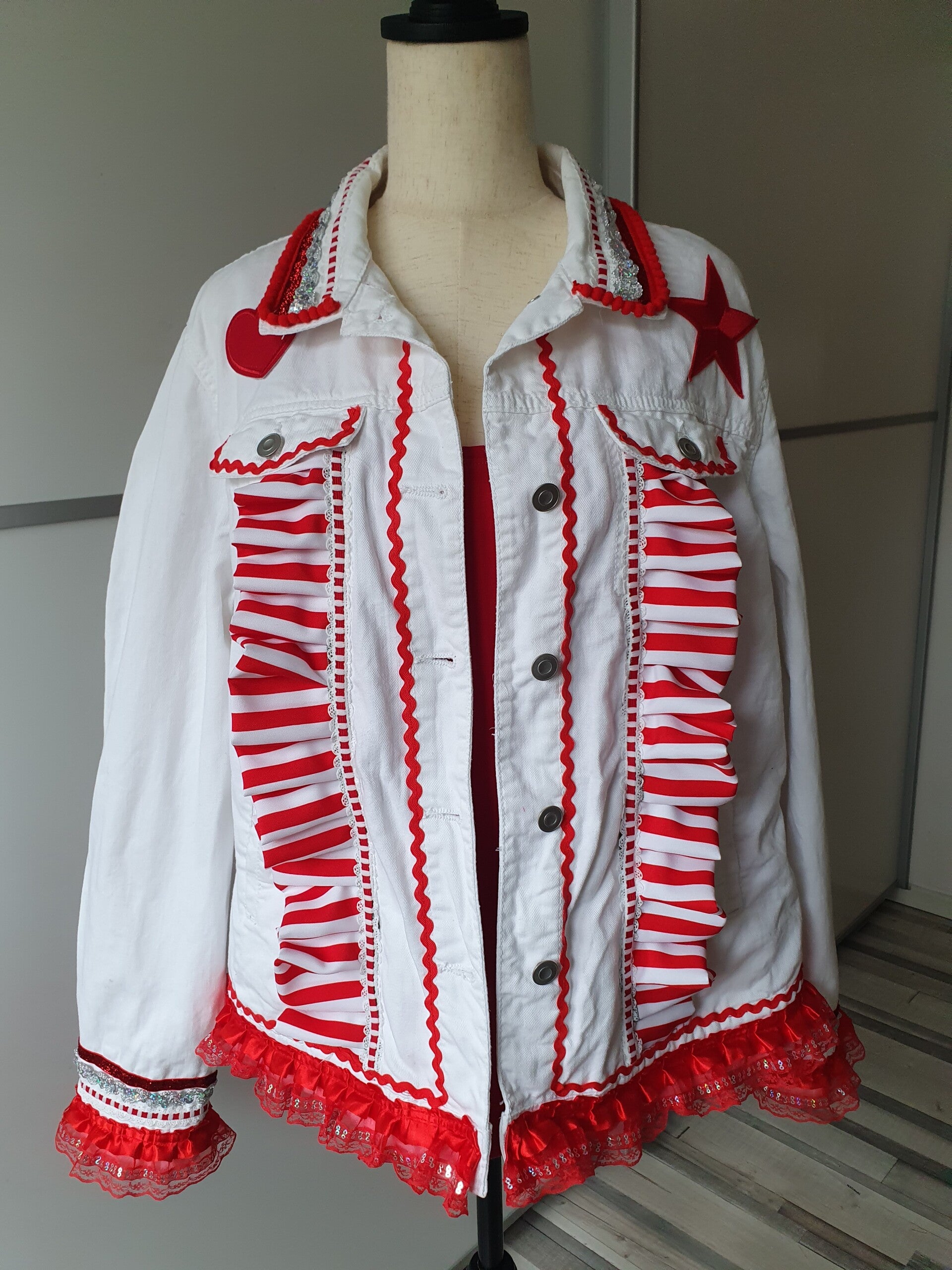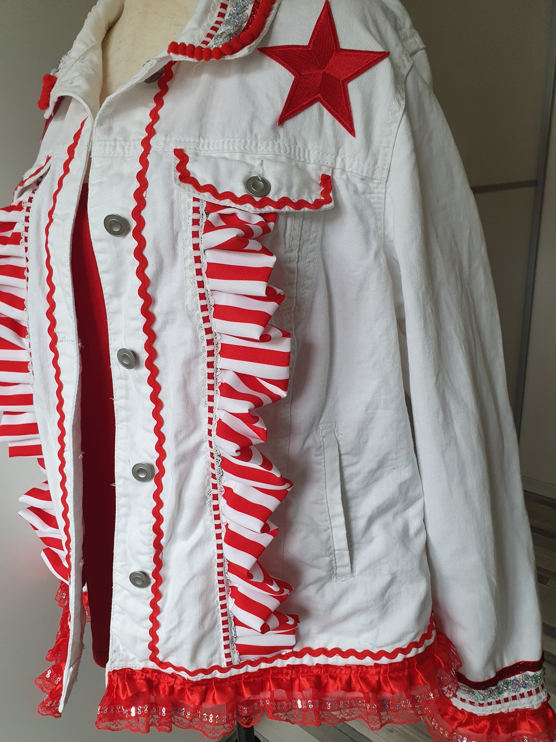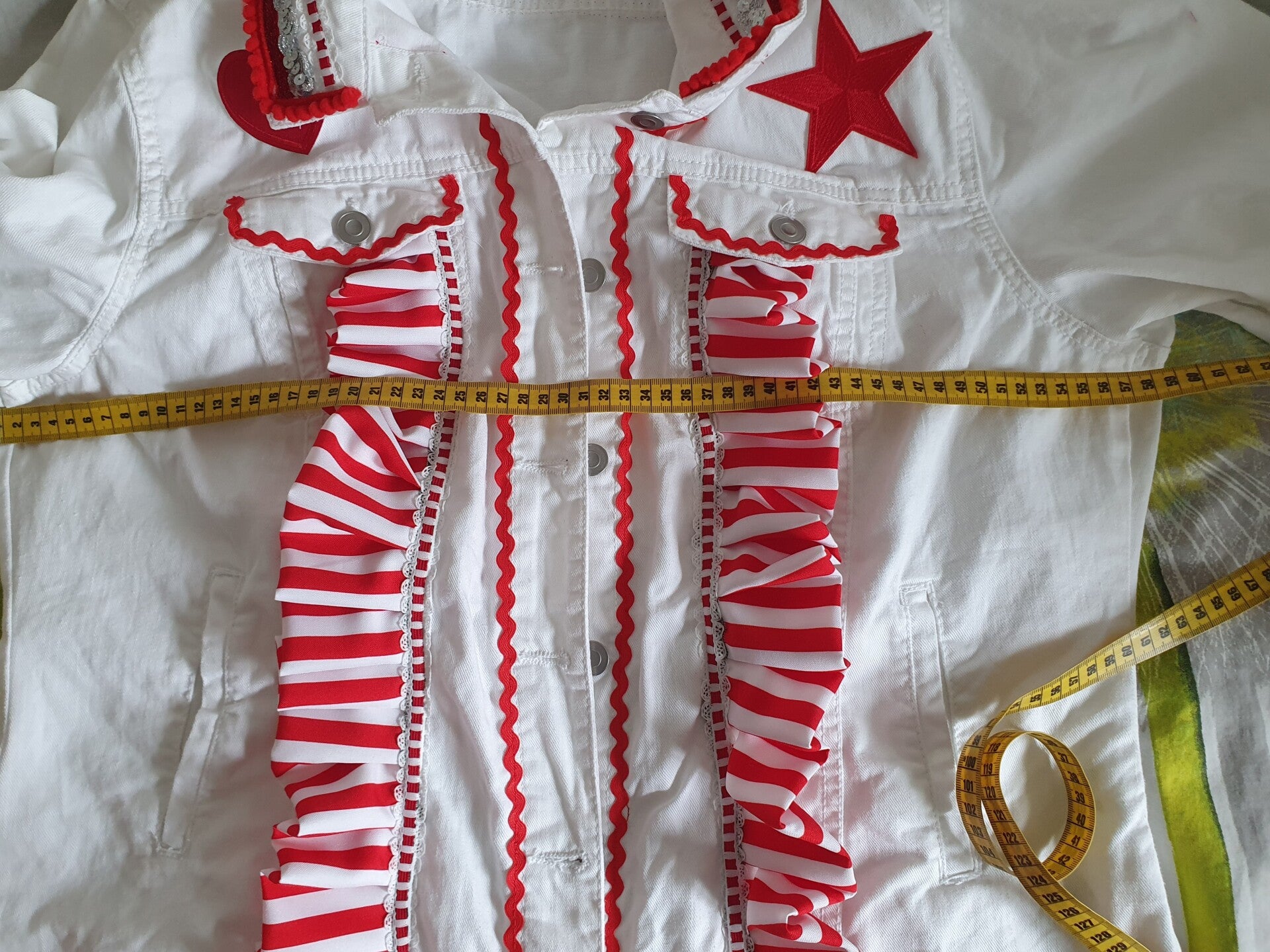Verkaufe hier eine Jeansjacke für Karneval in rot und weiß, gepimpt mit Rüschen,Borten ,Bändern ,Patches und einer Dom Applikation auf dem Rücken