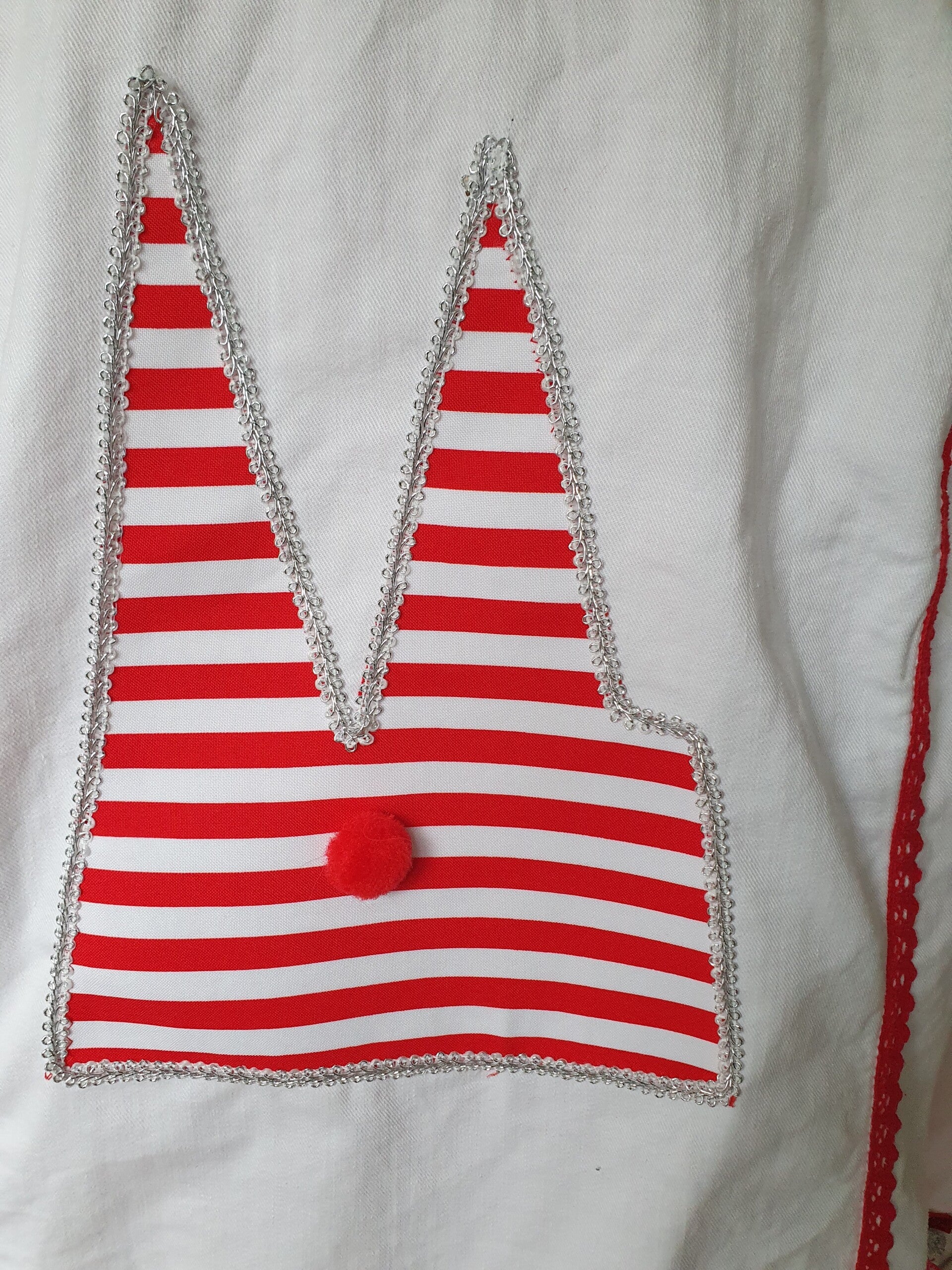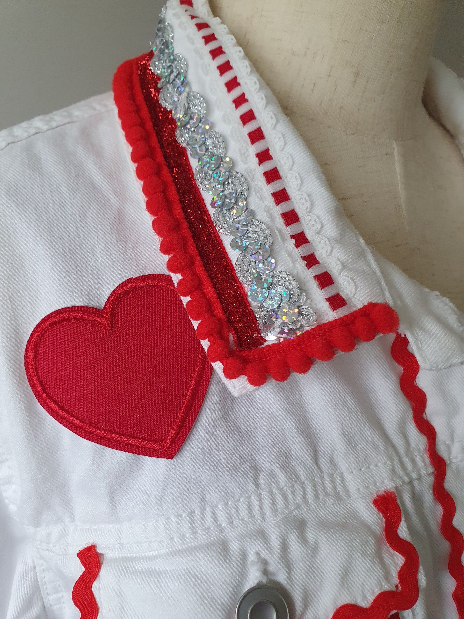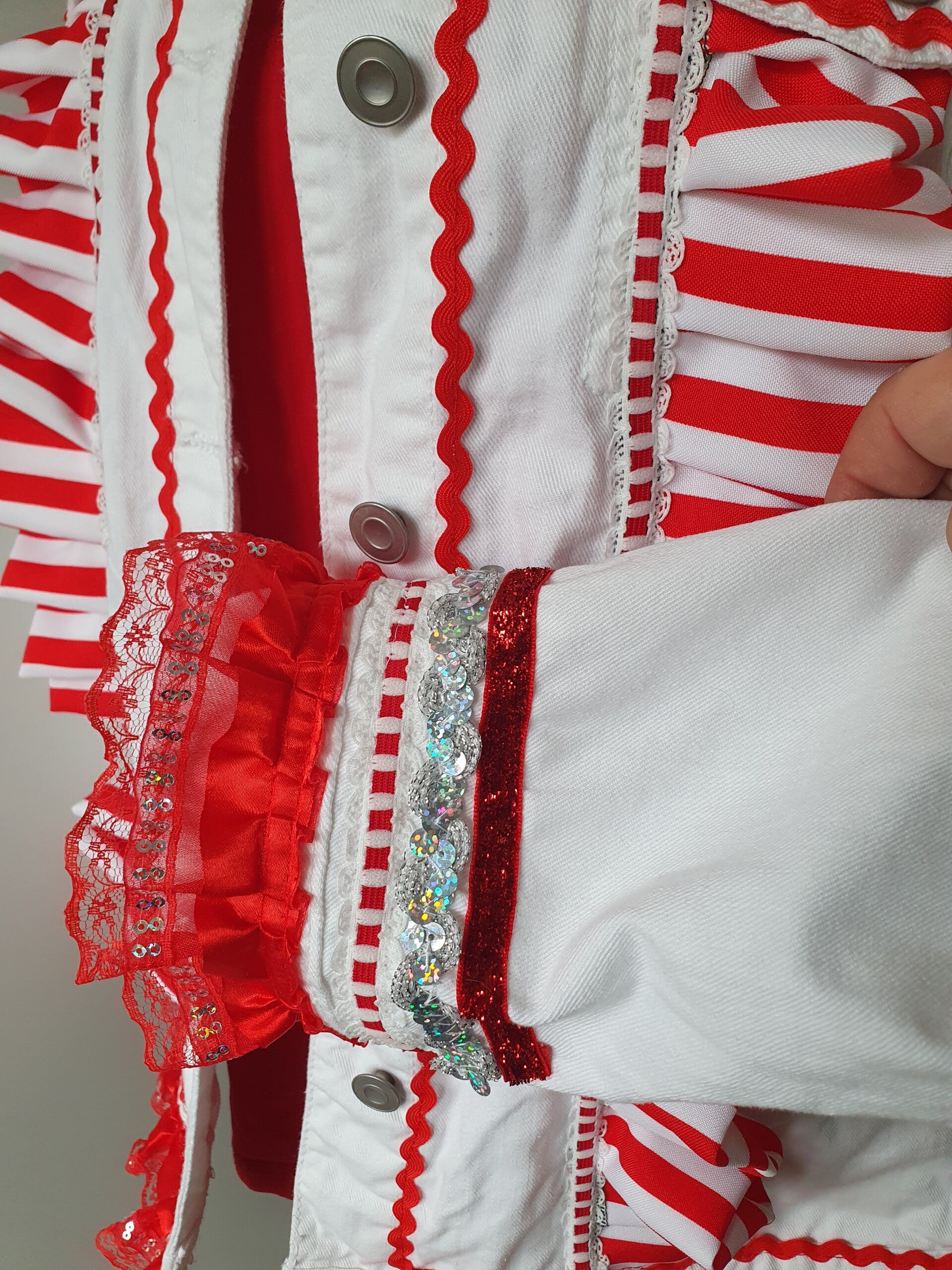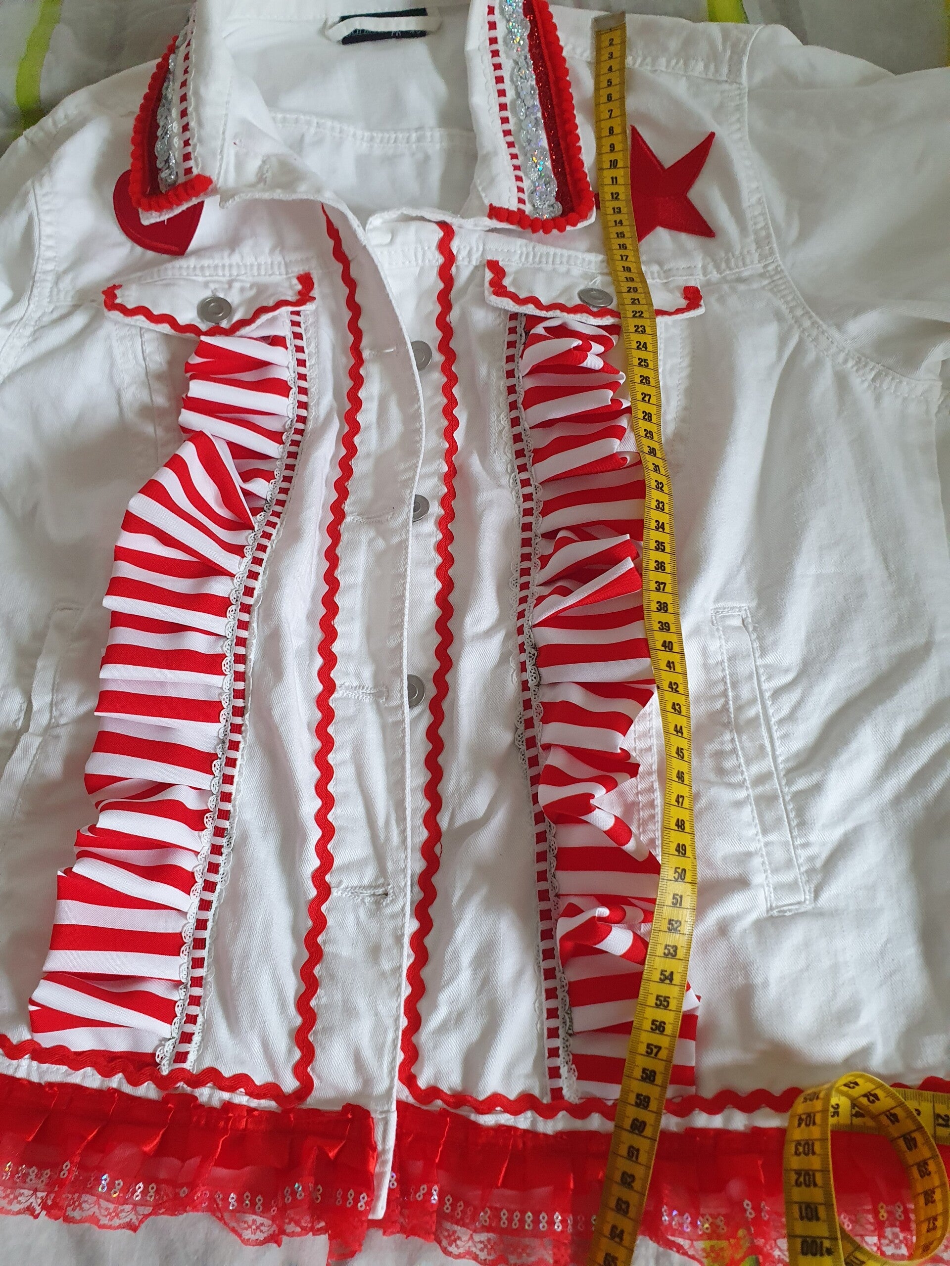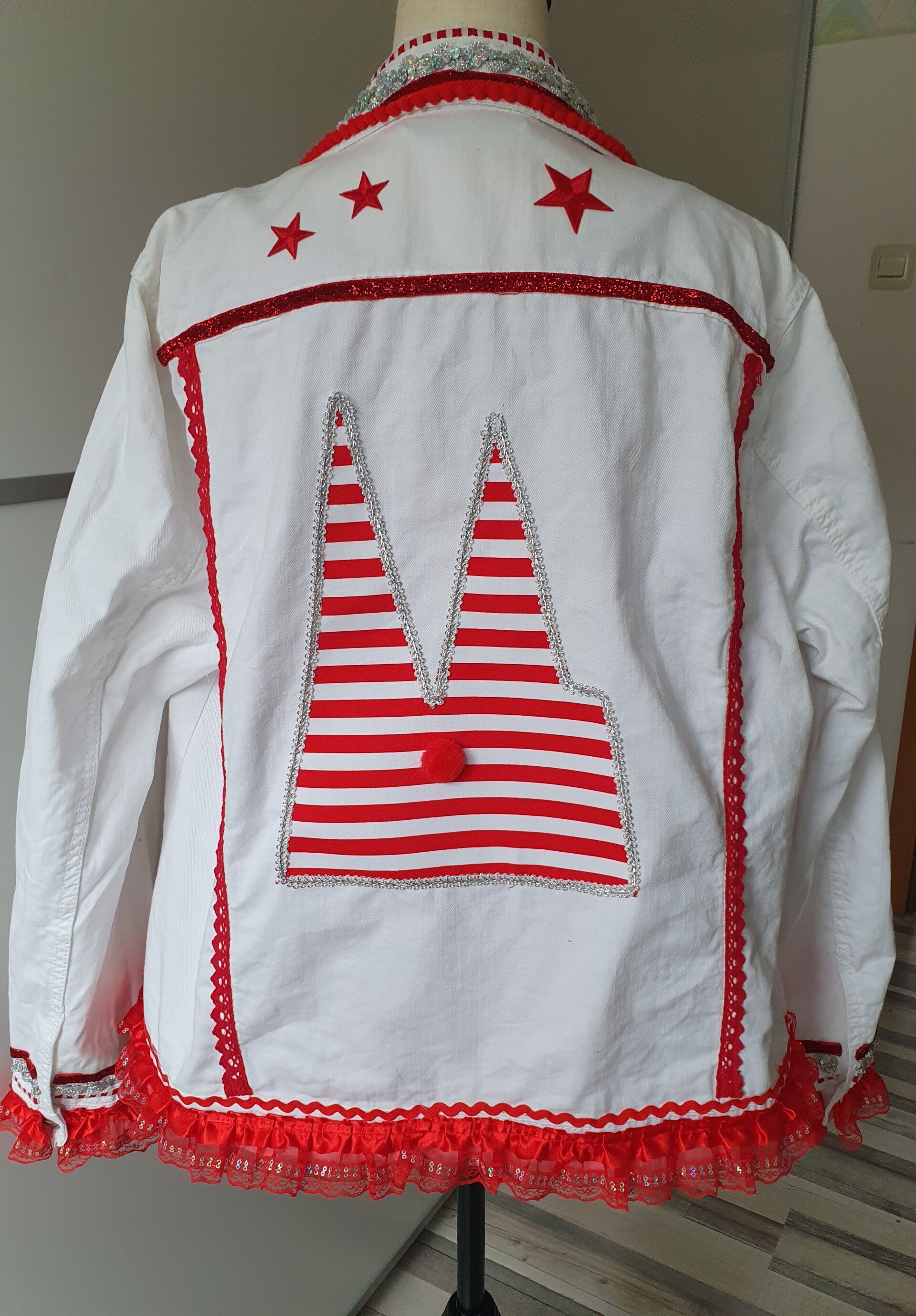 Verkaufe hier eine Jeansjacke für Karneval in rot und weiß, gepimpt mit Rüschen,Borten ,Bändern ,Patches und einer Dom Applikation auf dem Rücken