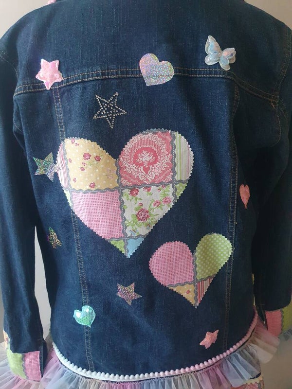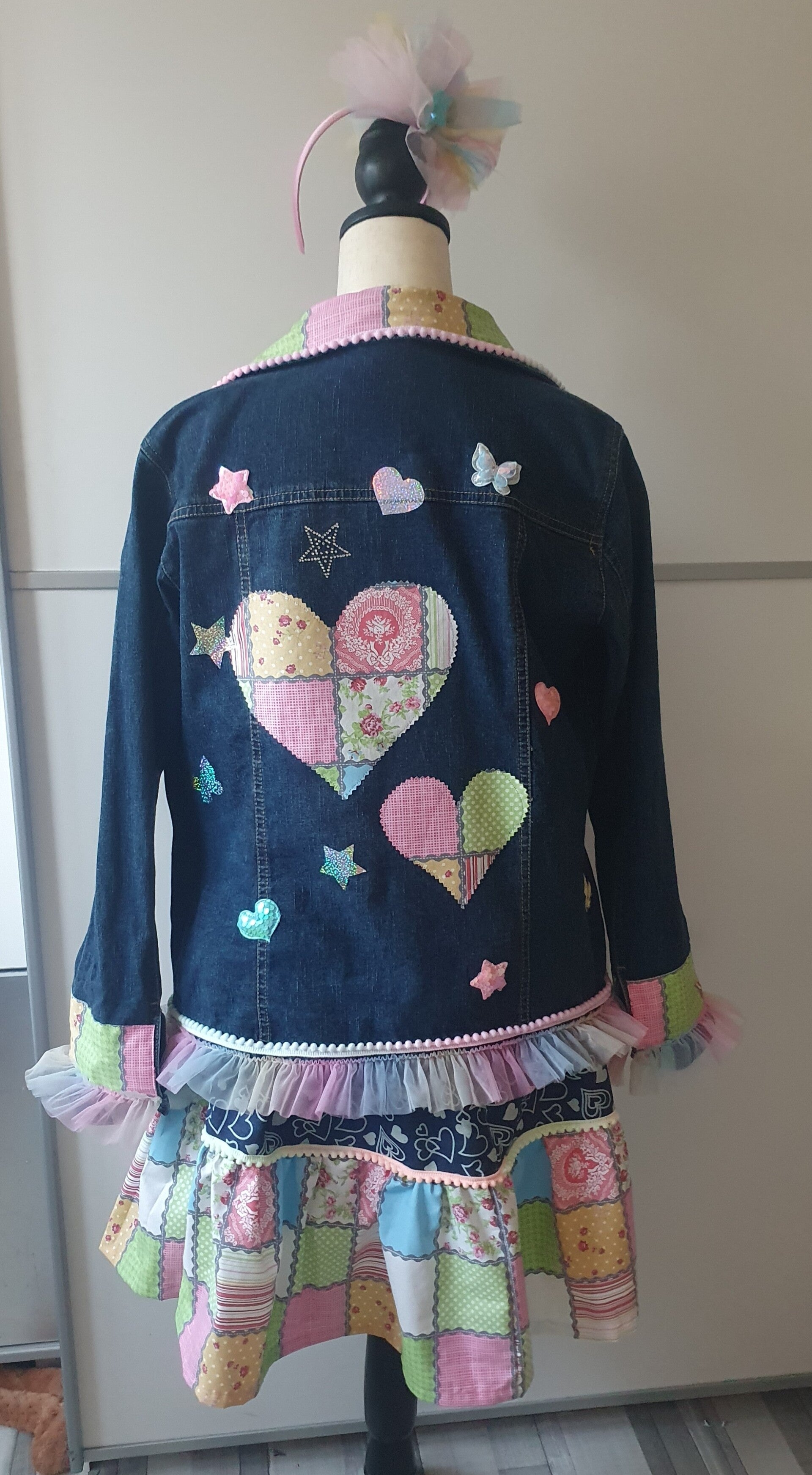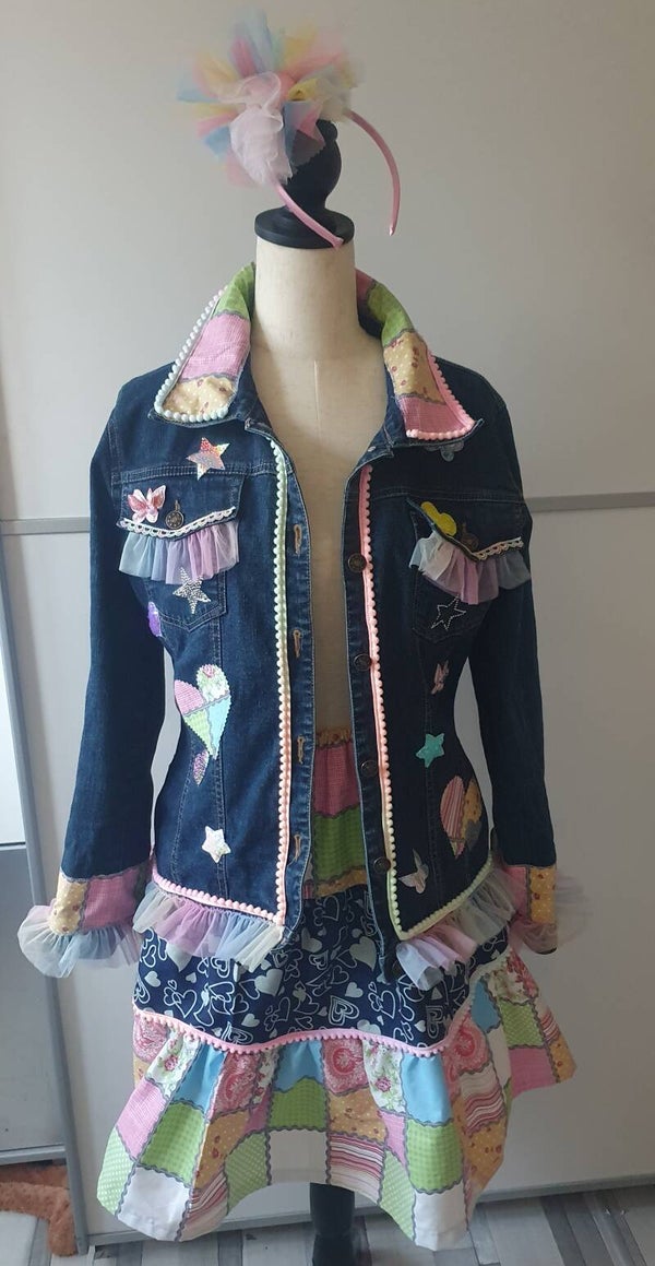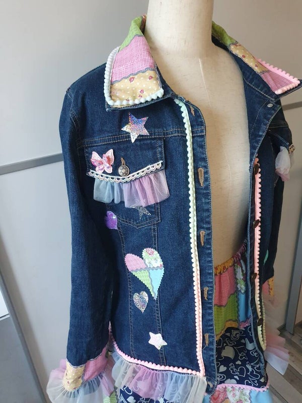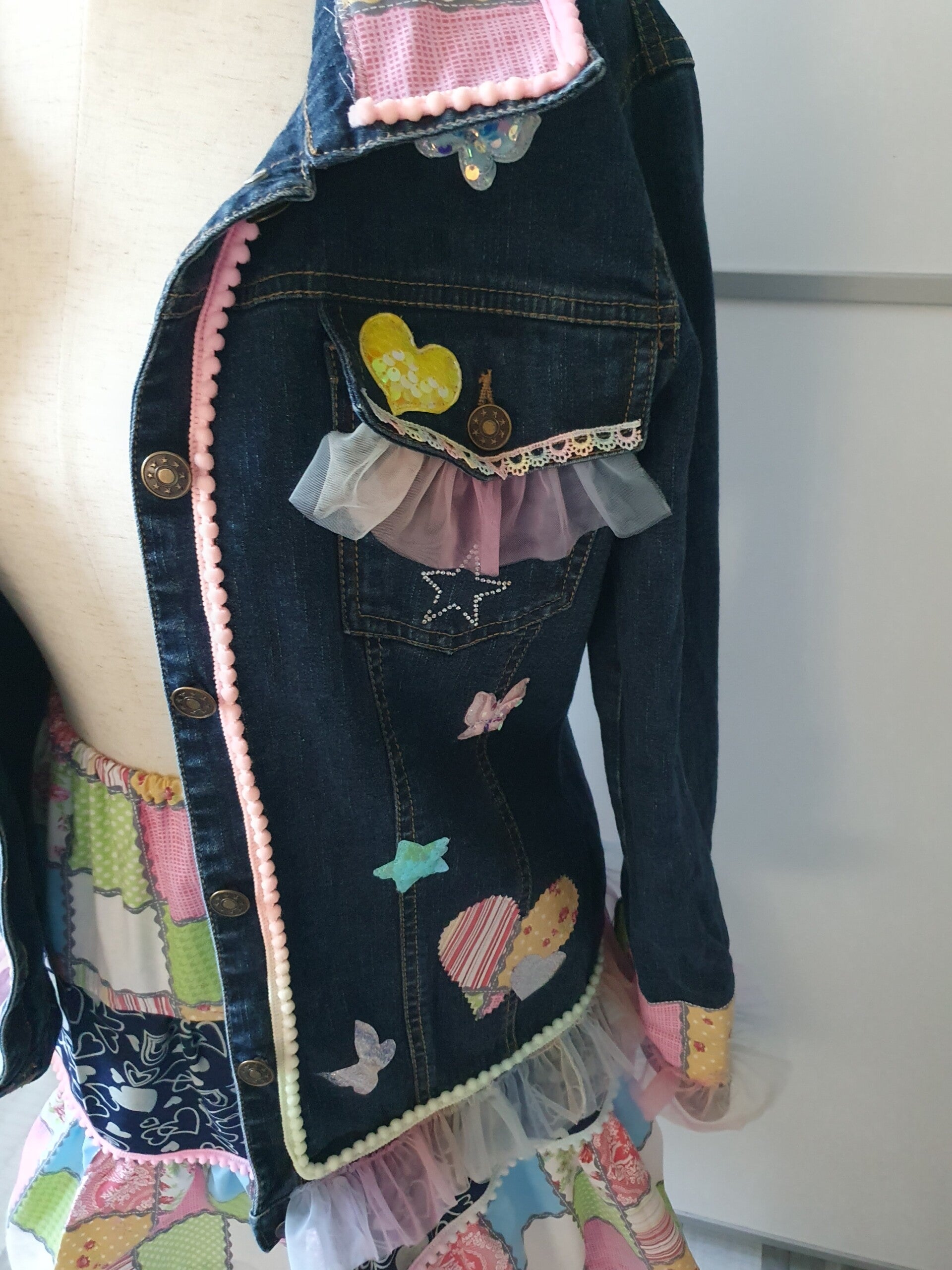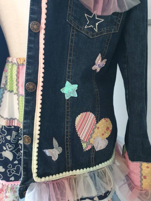 Bestehend aus einer aufwändig gepimpten Jeansjacke mit Spitzen,Borten ,Applikationen und Patches in Pastellfarben.