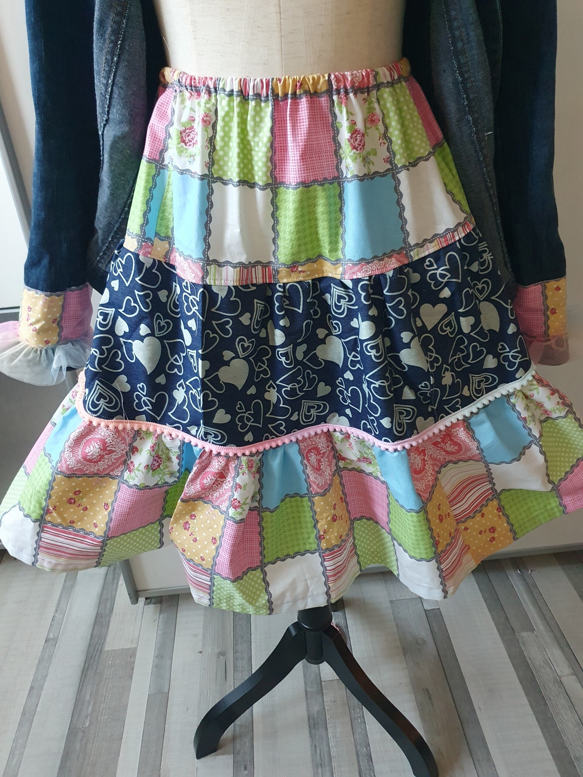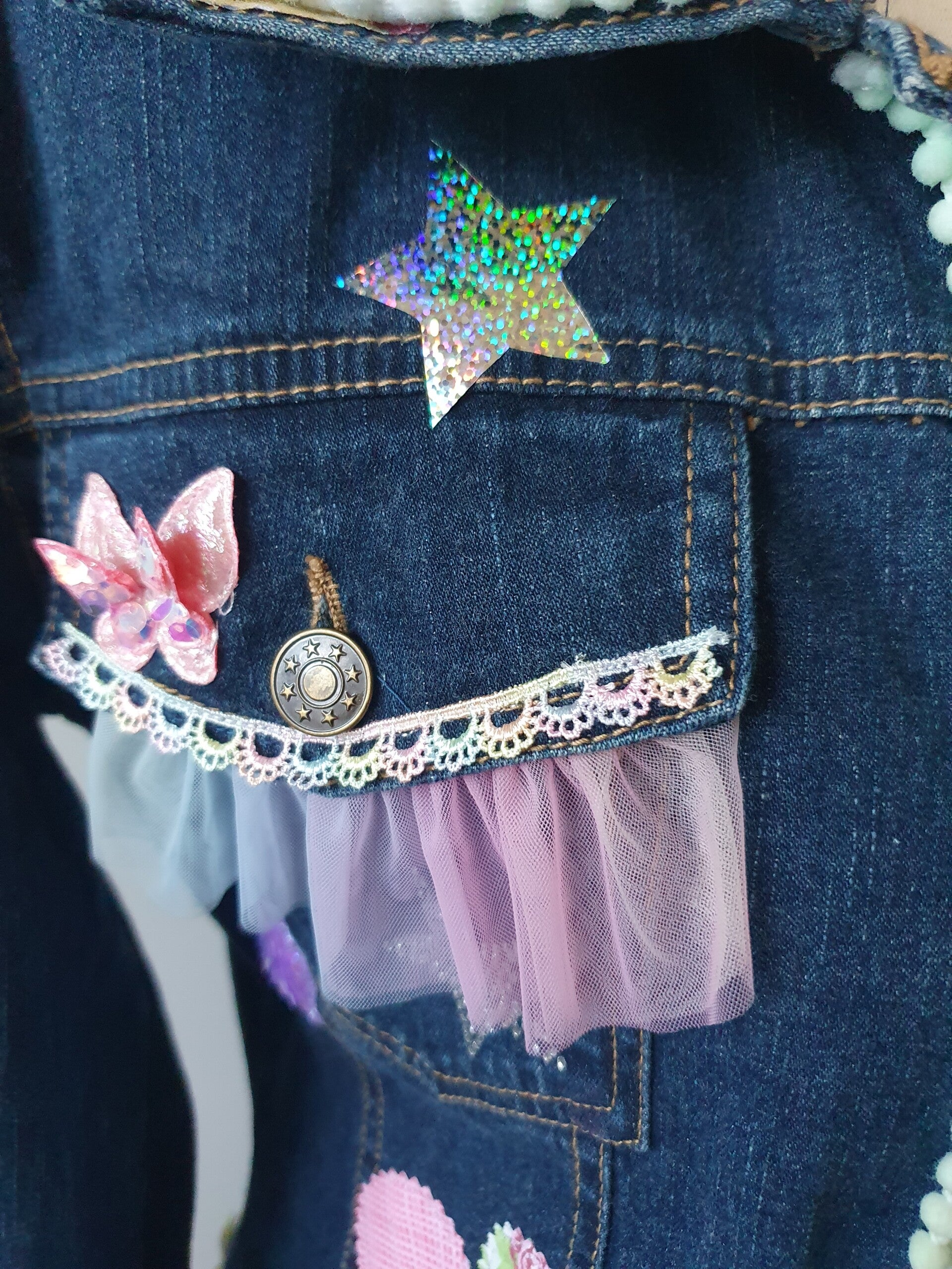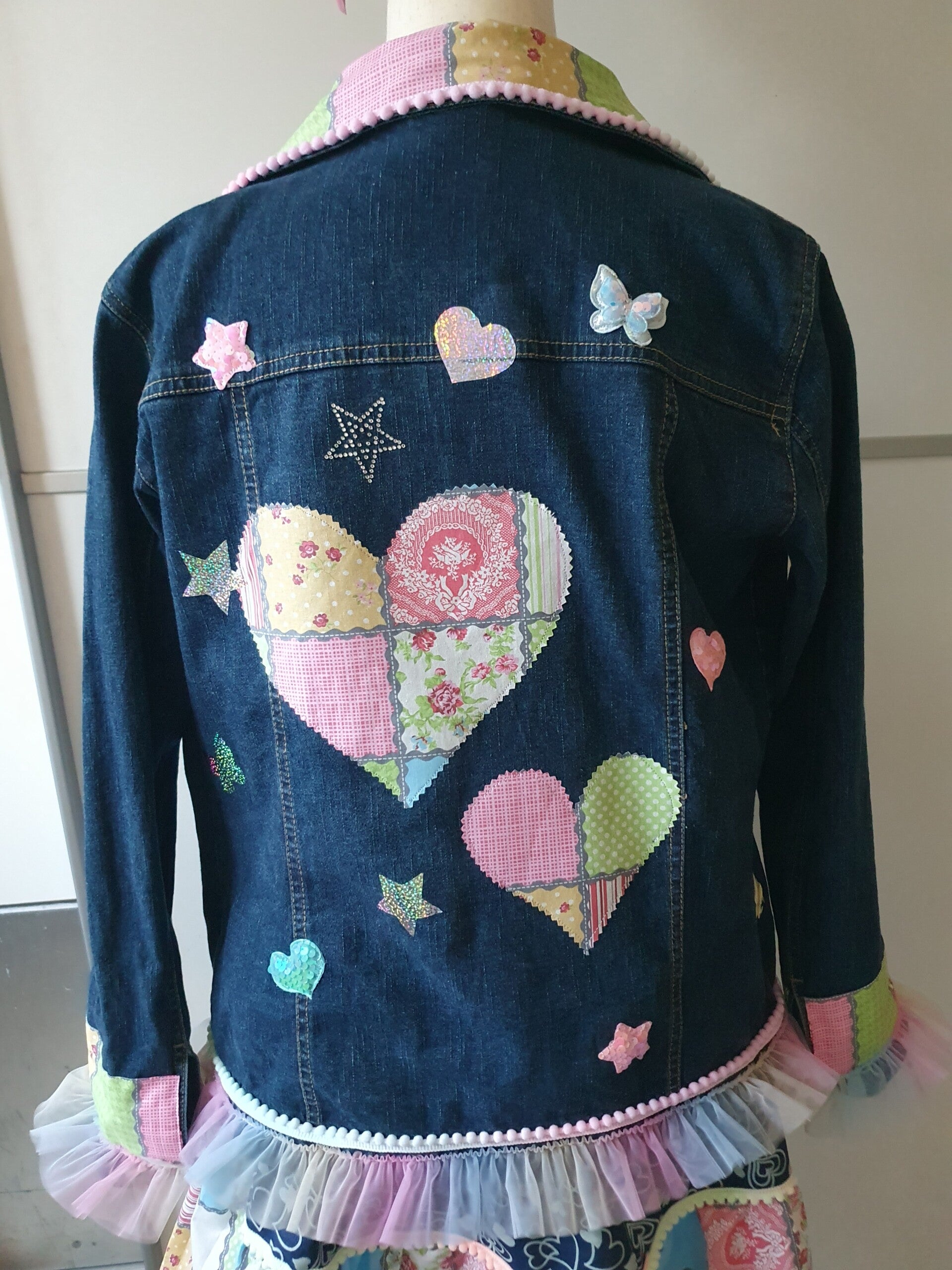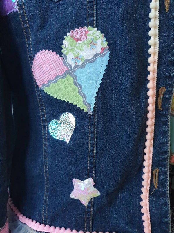 Bestehend aus einer aufwändig gepimpten Jeansjacke mit Spitzen,Borten ,Applikationen und Patches in Pastellfarben.