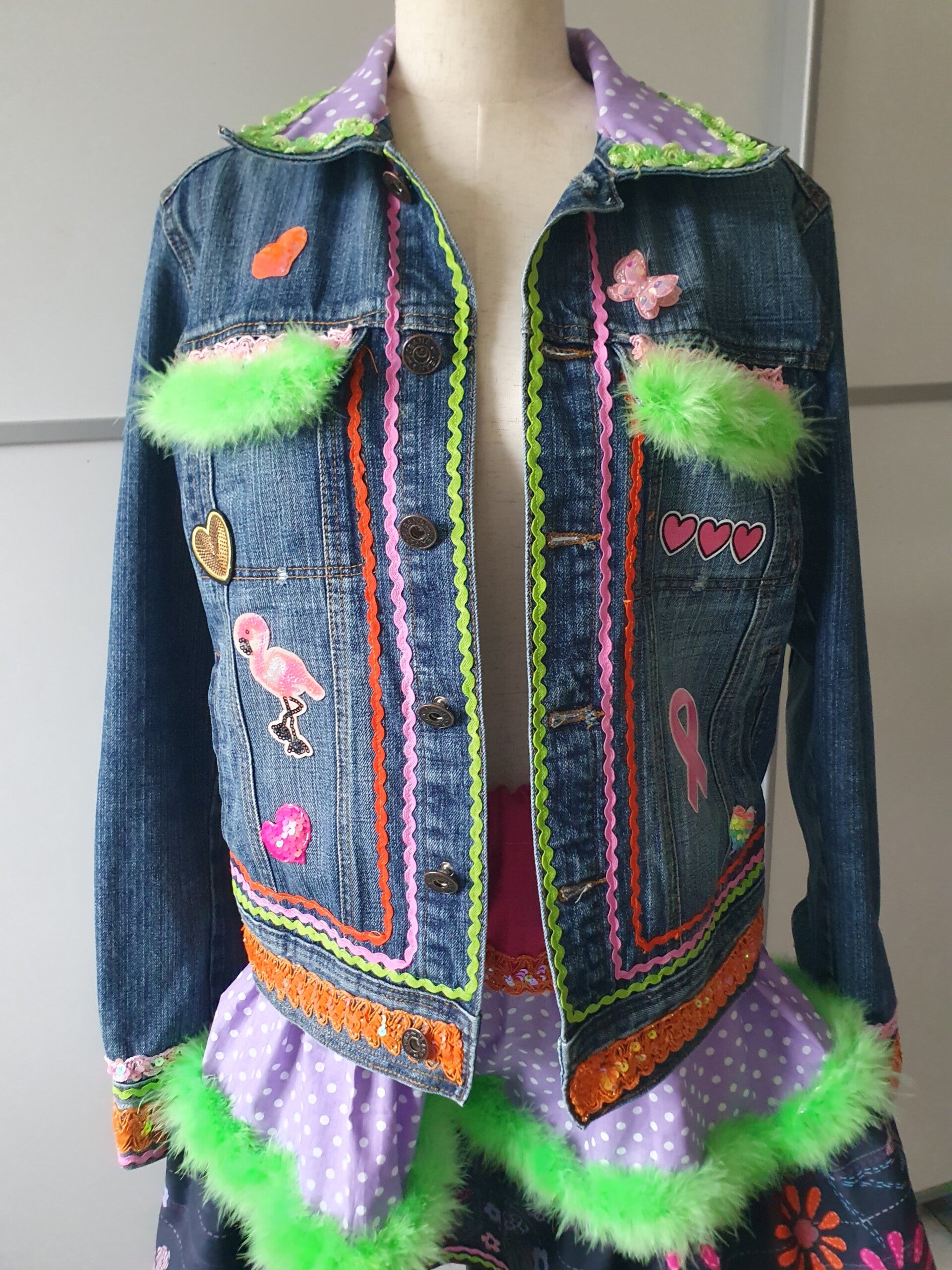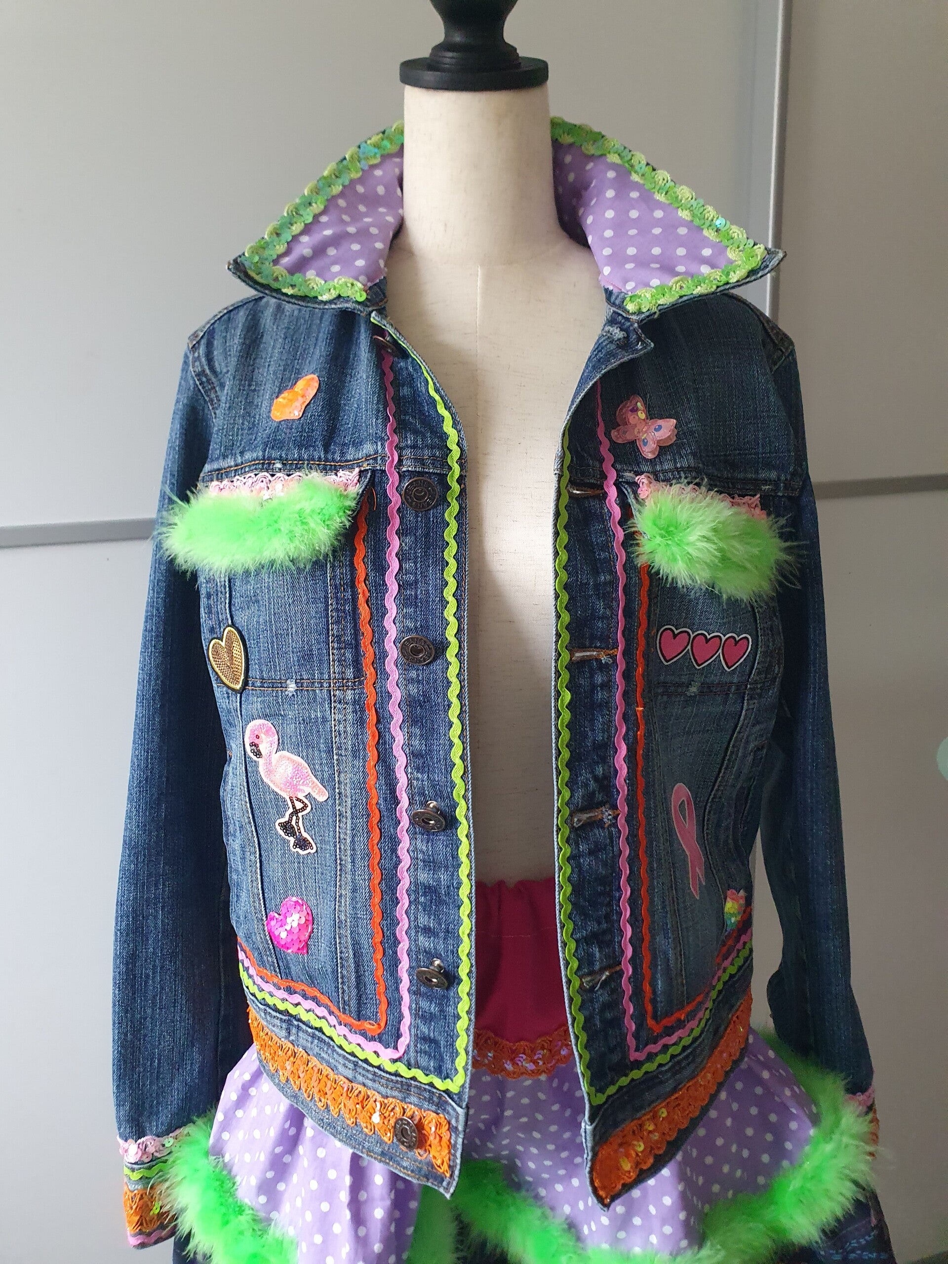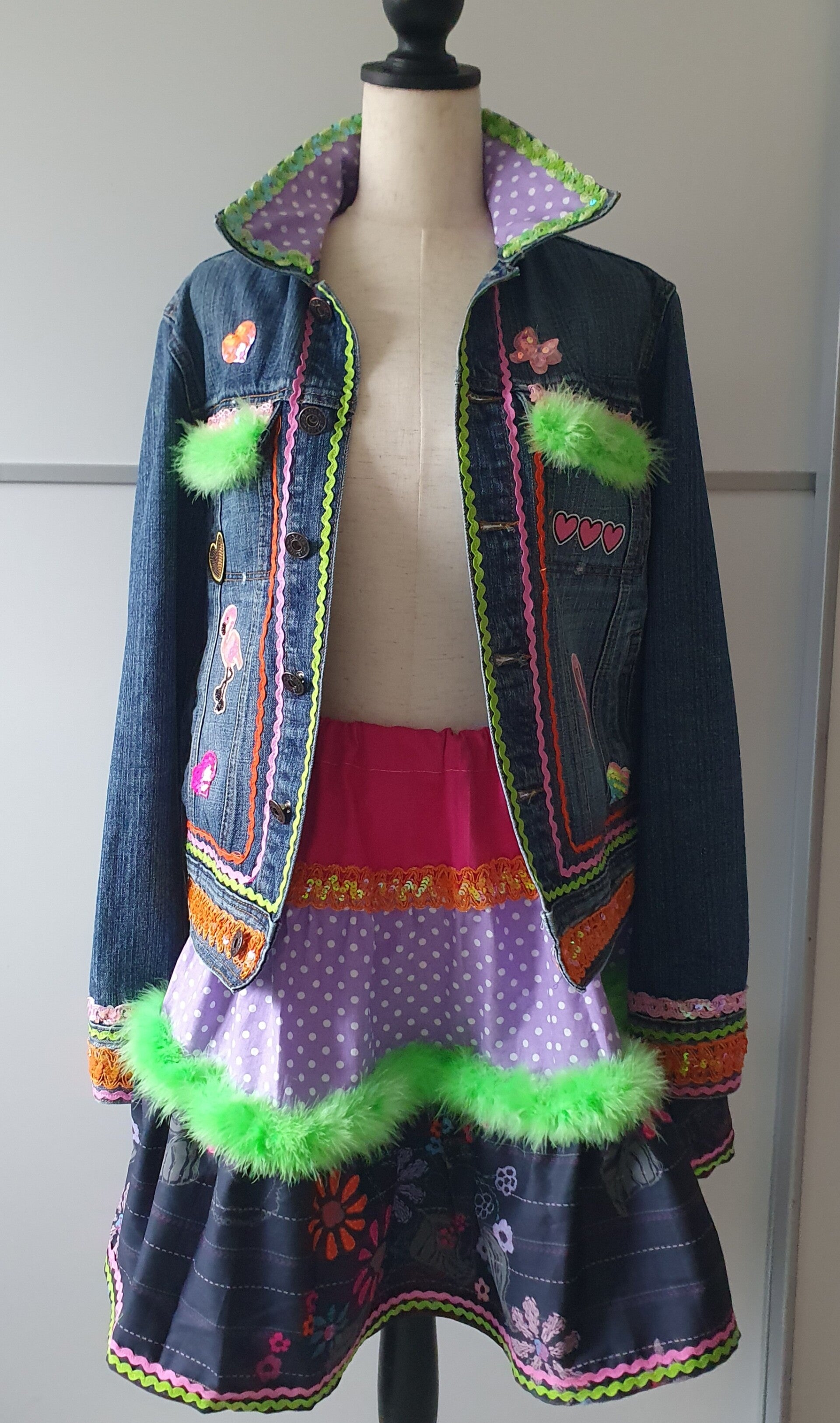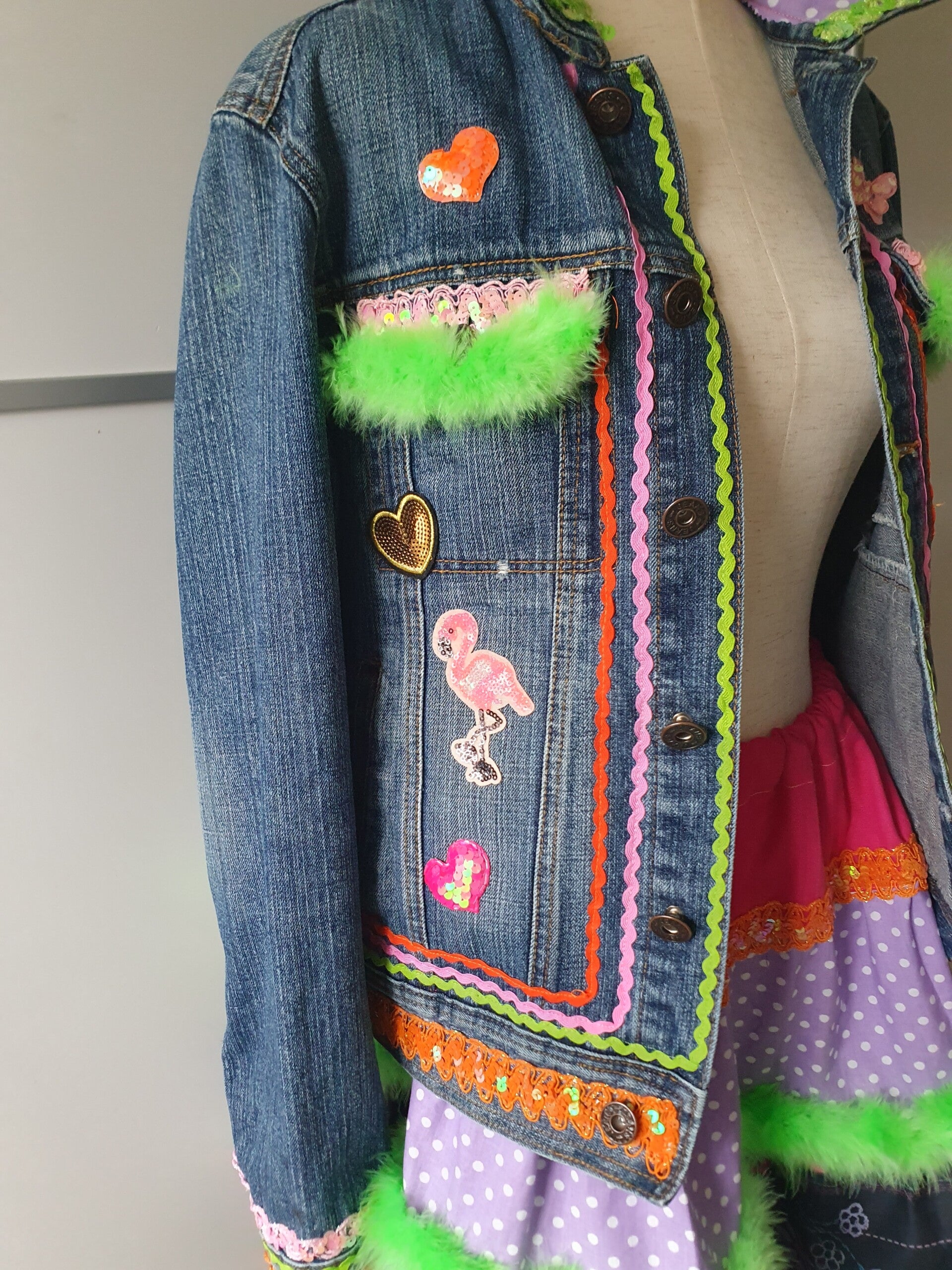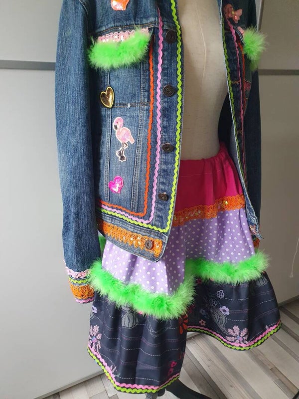 Bunt ist die Antwort ,gepimpte Jeansjacke mit Borten,Litzen ,Applikationen und Patches und einen 3- stufigen ,weit ausgestellten Rock .