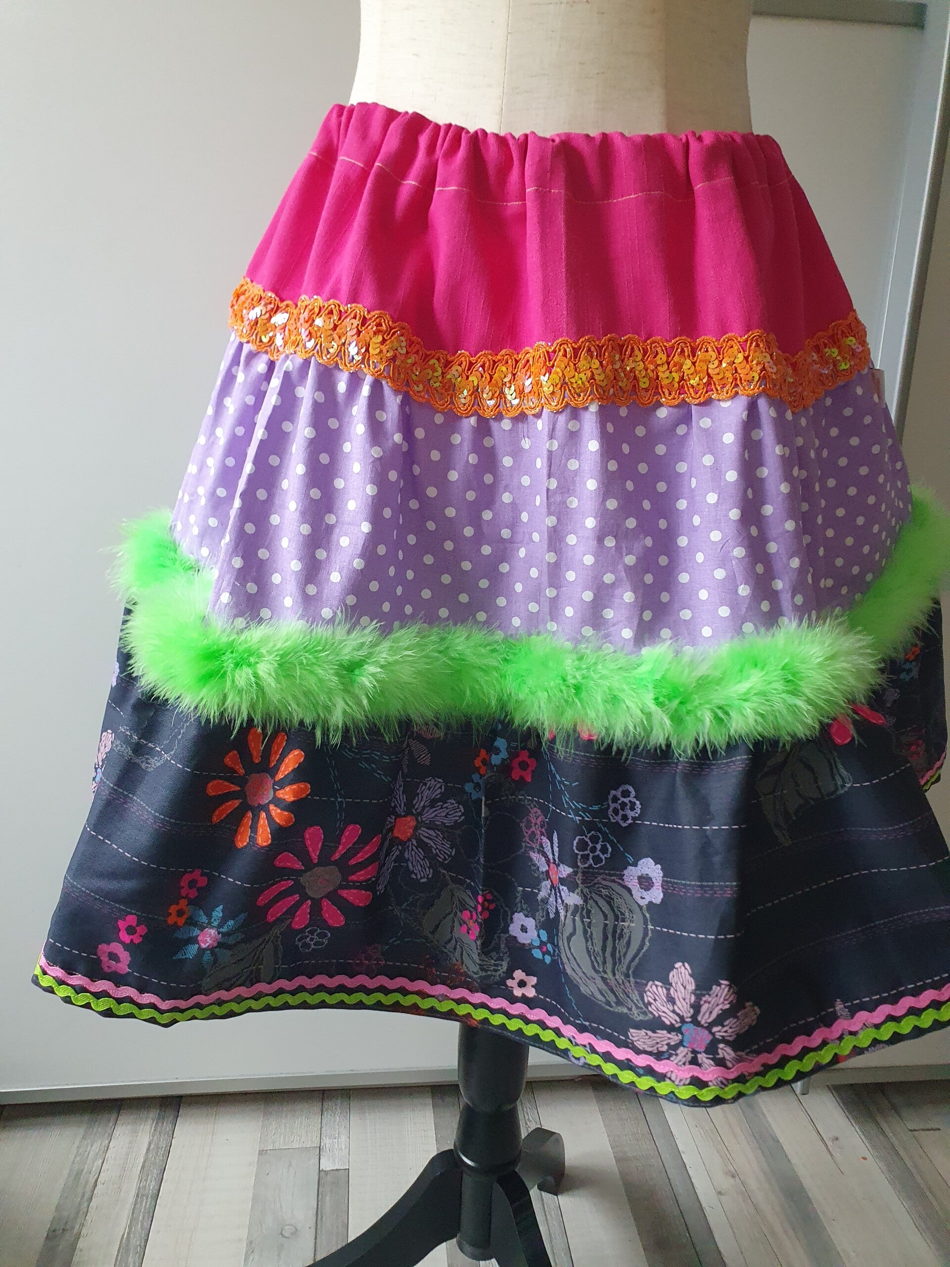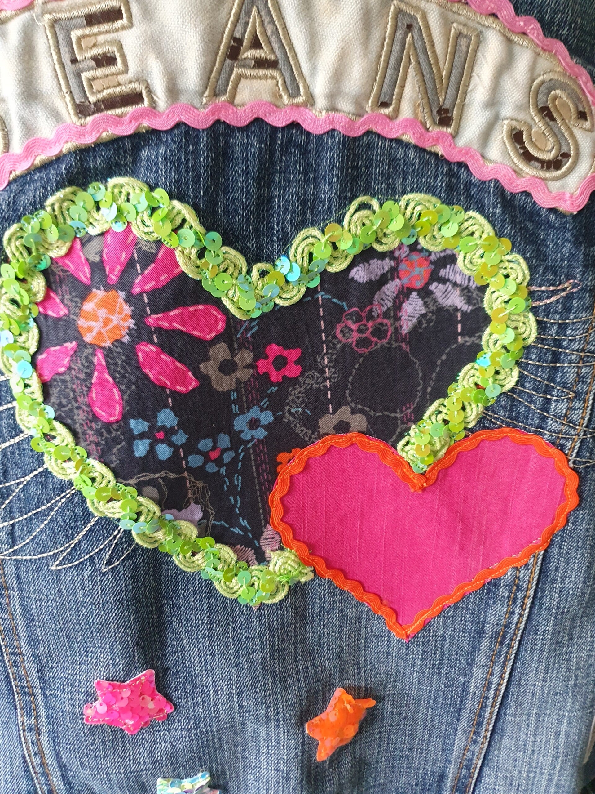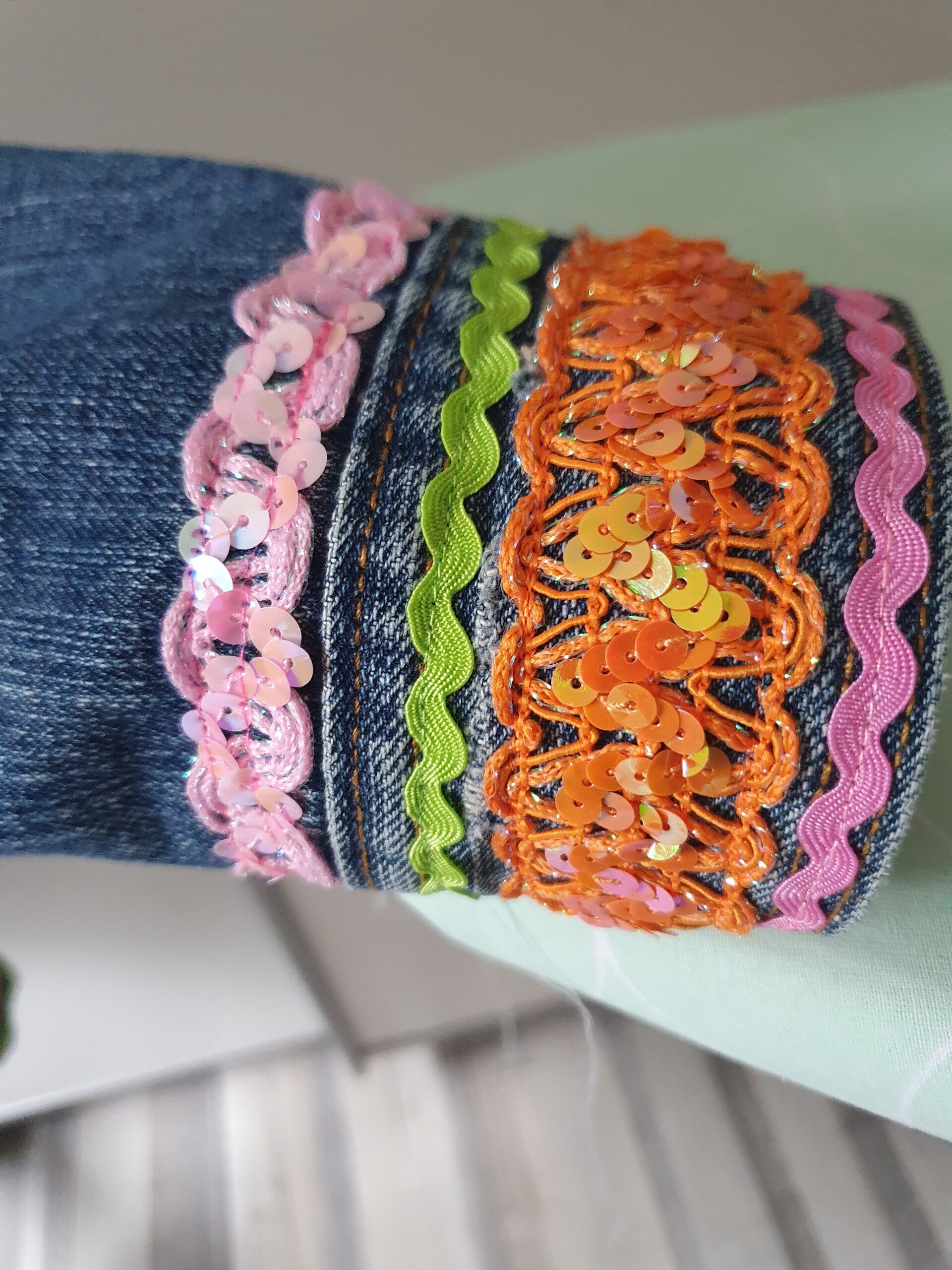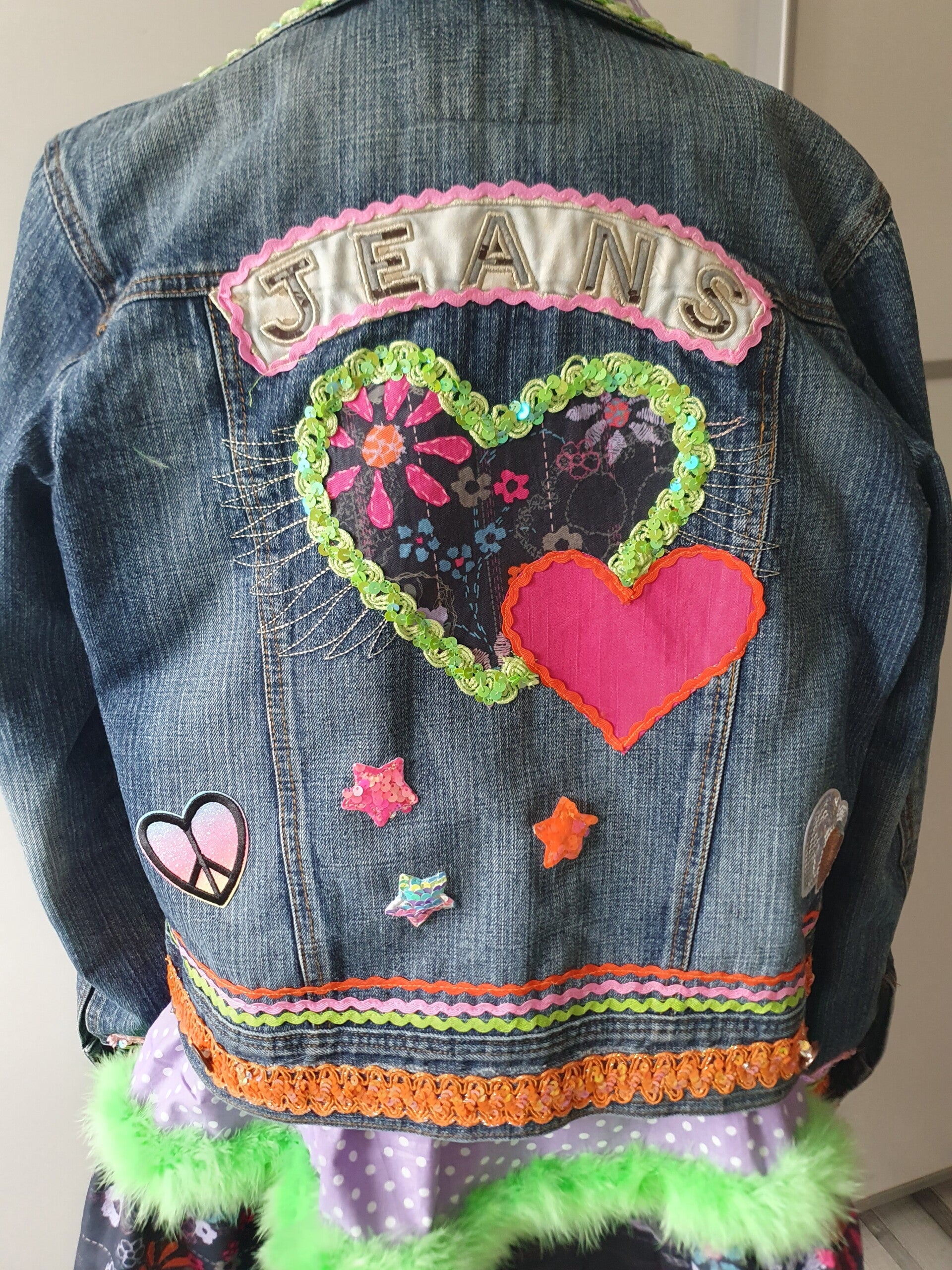 Bunt ist die Antwort ,gepimpte Jeansjacke mit Borten,Litzen ,Applikationen und Patches und einen 3- stufigen ,weit ausgestellten Rock .