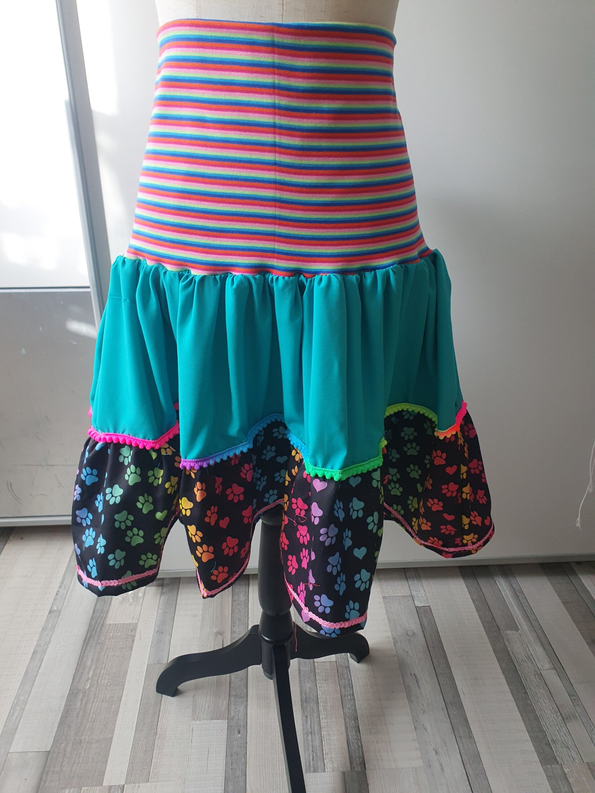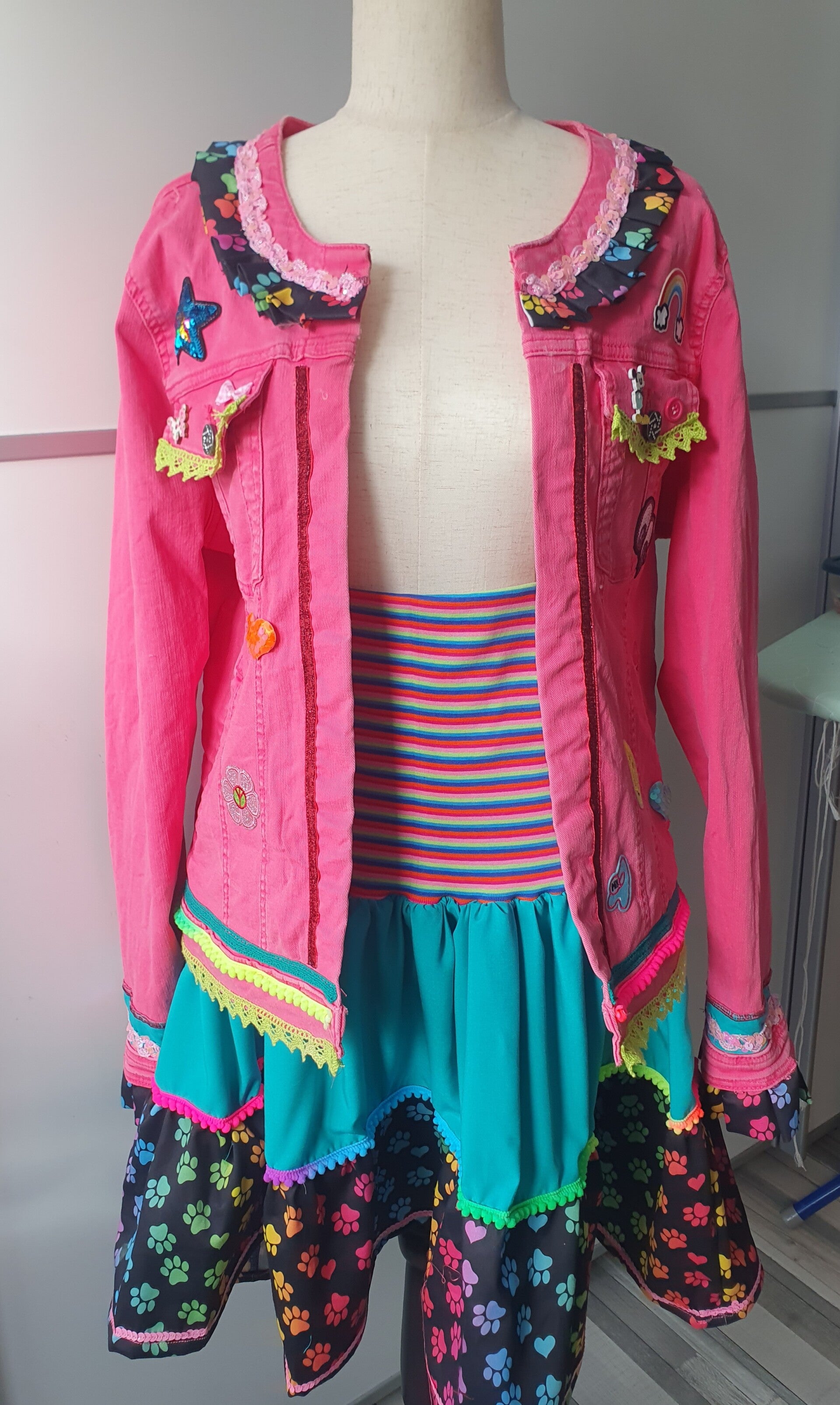 Bunt ist die Antwort ,gepimpte Jeansjacke mit Borten,Litzen ,Applikationen und Patches und einen 3- stufigen ,weit ausgestellten Rock .