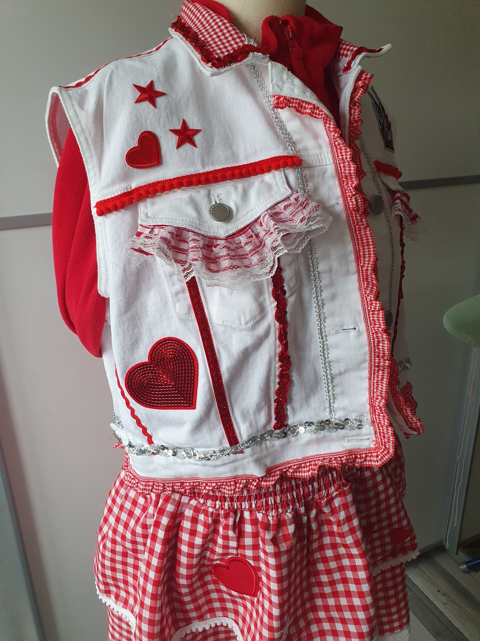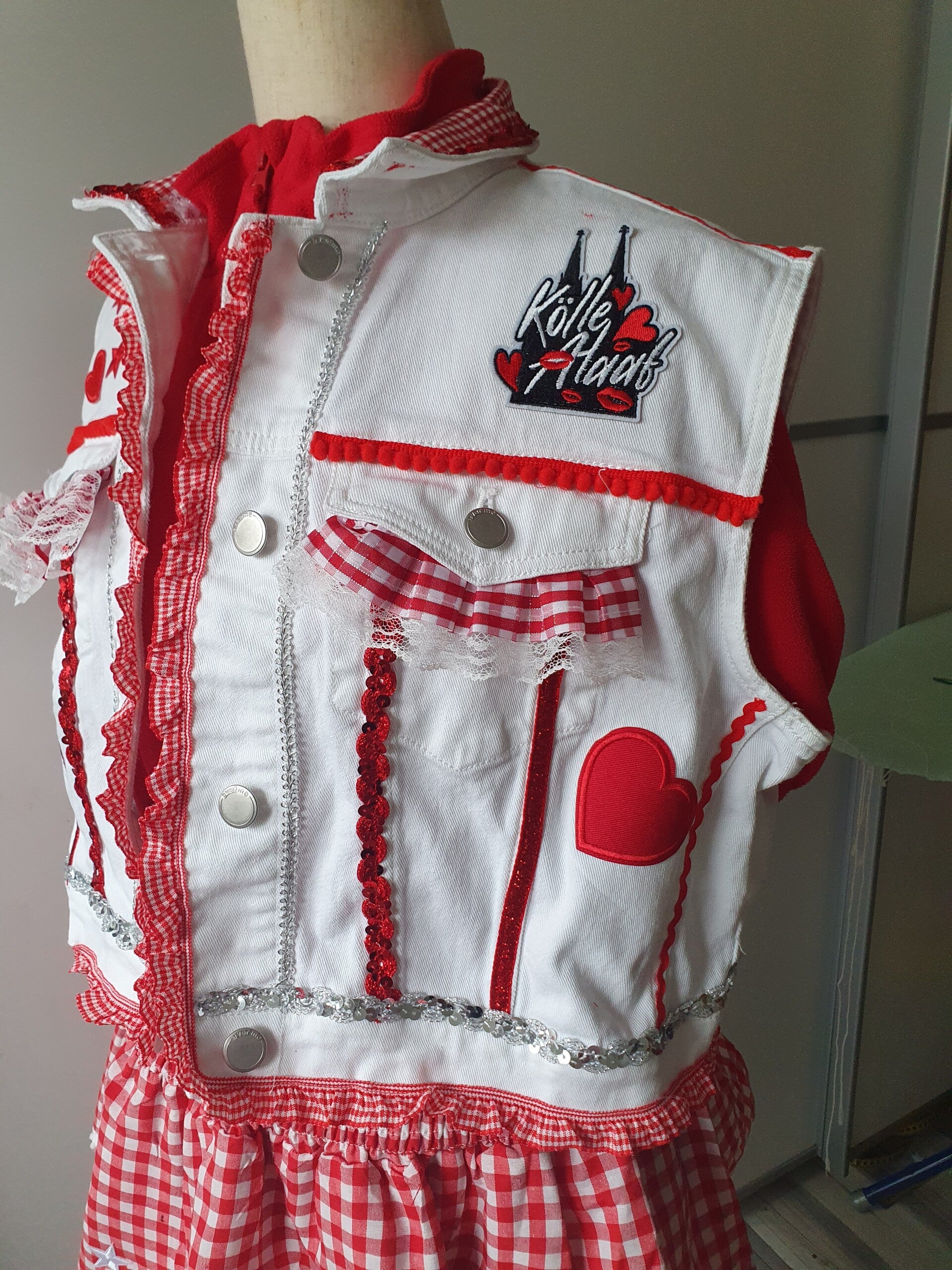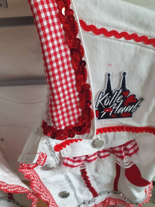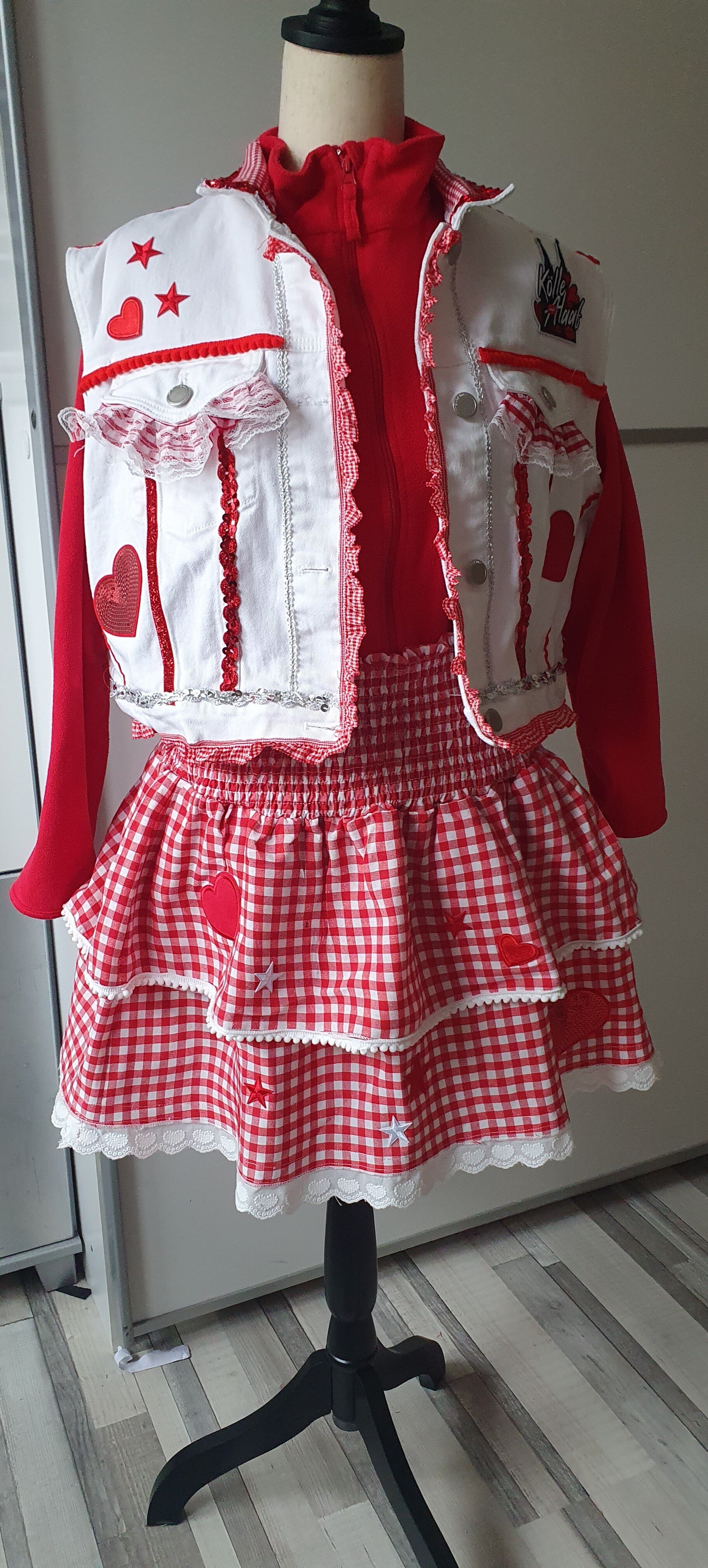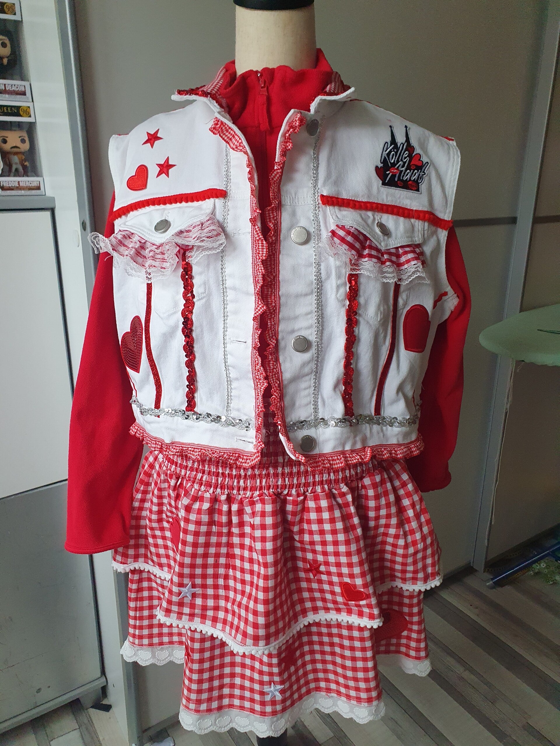 Bestehend aus gepimpter Jeansweste uns passendem Rock zum Thema Köln ,rot /weiß