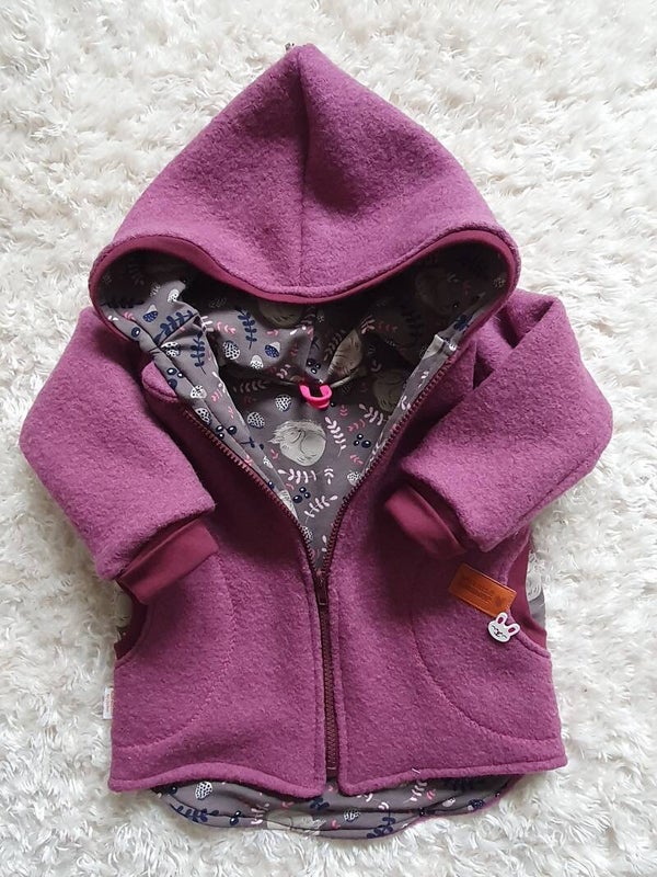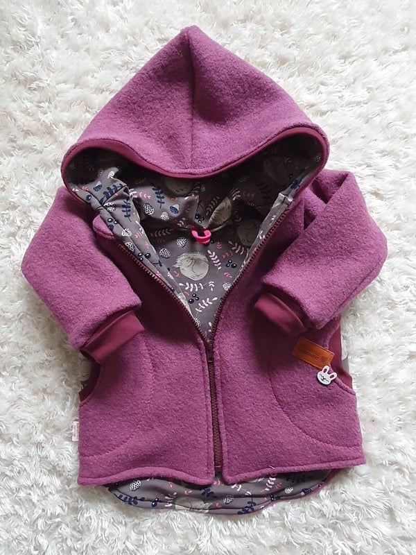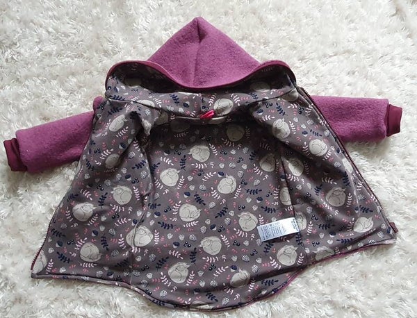 Innenfutter Baumwolljersey schlafendes Hörnchen, 2 unterfüttere Eingrifftaschen,Kapuze,Mitwachsbündchen und Reißverschluss.