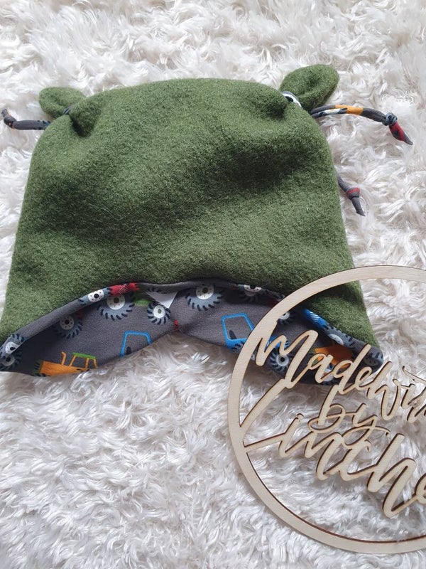 Süße Öhrchenmütze aus Wollwalk, innen gefüttert mit Baumwolljersey