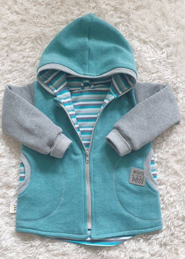 Die Jacke hat einen Reißverschluss mit Kinnschutz , 2 unterfütterte Eingrifftaschen, einer Kapuze und vielen kleinen Details.